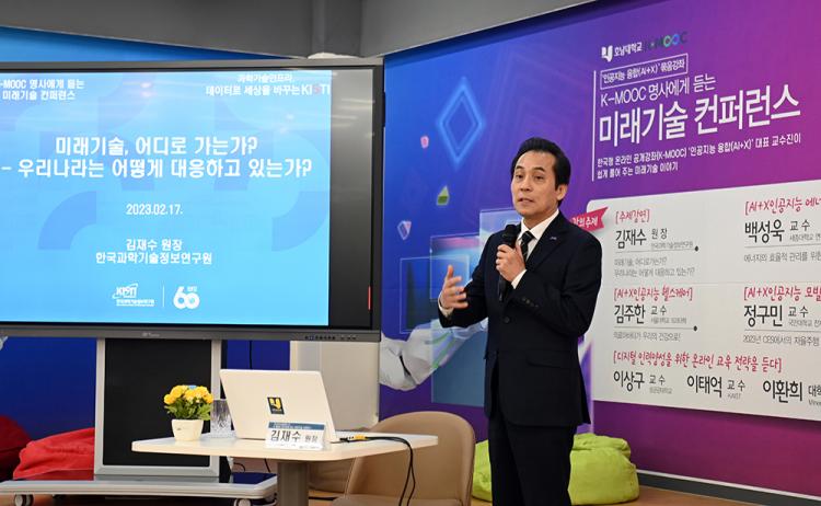 K-MOOCÀÇ ¡®ÀΰøÁö´É À¶ÇÕ(AI+X)¡¯ °Á Ȯ»êÀ» À§ÇØ Çà»ç ÇöÀå°ú À¯Æ©ºê ¡®È£³²´ëTV¡¯¸¦ ÅëÇØ ½Ç½Ã°£ Áß°èµÈ À̹ø ÄÁÆÛ·±½º´Â Çѱ¹°úÇбâ¼úÁ¤º¸¿¬±¸¿ø(KISTI) ±èÀç¼ö ¿øÀåÀÇ ¡®¹Ì·¡±â¼ú, ¾îµð·Î °¡´Â°¡? ¿ì¸®³ª¶ó´Â ¾î¶»°Ô ´ëÀÀÇØ¾ß Çϴ°¡¡¯¶ó´Â ÁÖÁ¦¹ßÇ¥¸¦ ½ÃÀÛÀ¸·Î ÀΰøÁö´É À¶ÇÕ(AI+X) °¢ °Á ´ëÇ¥ ±³¼öÀÚµéÀÌ ÀΰøÁö´É°ú ¹Ì·¡±â¼ú¿¡ ´ëÇØ ½±°í Àç¹ÌÀÖ°Ô Ç®¾î ³ª°¡´Â ÅäÅ©ÄܼƮ°¡ À̾îÁ³´Ù.