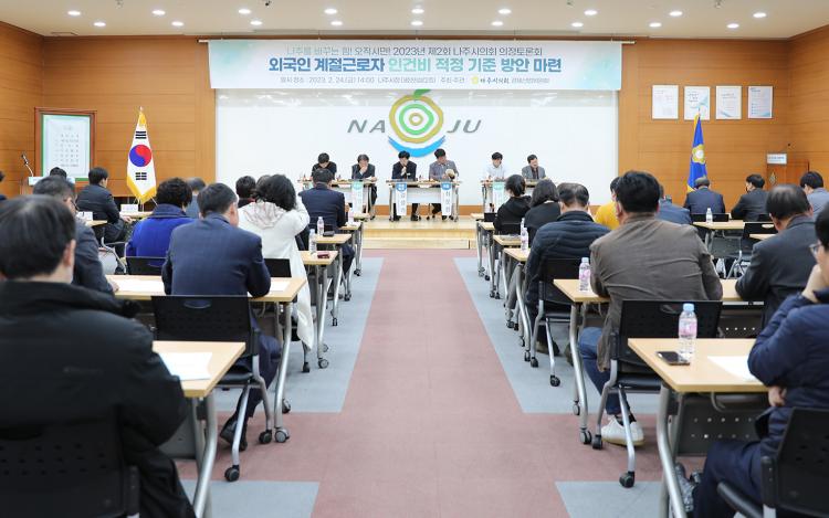 [ÅåÅå´º½º]³ªÁÖ½ÃÀÇȸ(ÀÇÀå ÀÌ»ó¸¸)´Â 24ÀÏ ¿ÀÈÄ 2½Ã, ³ªÁÖ½Ãû ´ëȸÀǽÇ(2Ãþ)¿¡¼ ¡®¿Ü±¹ÀÎ °èÀý±Ù·ÎÀÚ ÀΰǺñ ÀûÁ¤ ±âÁØ ¹æ¾È ¸¶·Ã¡¯À» À§ÇÑ 'Á¦2ȸ ³ªÁÖ½ÃÀÇȸ ÀÇÁ¤Åä·Ðȸ'¸¦ °³ÃÖ °ü°èÀÚµé°ú ½Ã¹ÎµéÀÇ ¿¶í Åä·ÐÀÇ ÀåÀ» ¸¶·ÃÇß´Ù.