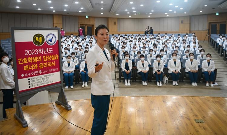 À̳¯ ±³À°Àº °£È£Çаú ÀÌ¿¬ÈÄ ±³¼ö°¡ Çѱ¹°£È£»çÀÇ À±¸®°·ÉÀ» ÅëÇØ Çлý°£È£»ç°¡ °¡Á®¾ß ÇÒ Åµµ ¹× ½Ç½À¸Å³Ê¿¡ ´ëÇØ »ç·Ê¸¦ µé¾î ¼³¸íÇßÀ¸¸ç, 3Çгâ ÇлýµéÀº º´¿ø ÀÓ»ó½Ç½ÀÀ̶ó´Â »õ·Î¿î ȯ°æ¿¡¼ °¡Á®¾ßÇÒ ¸Å³Ê¿Í À±¸®ÀǽÄÀ» ´Ù½Ã Àϱú¿ì´Â °è±â·Î »ï´Â´Ù´Â ´ÙÁüÀ» Çß´Ù.