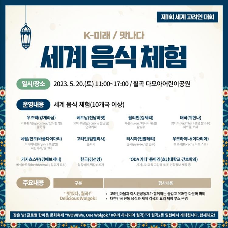 20ÀÏ ¿ÀÀü 10½Ã 30ºÐºÎÅÍ ¿ÀÈÄ 5½Ã±îÁö´Â ¿ù°î ´Ù¸ð¾Æ¾î¸°À̰ø¿ø¿¡¼ ¡®¼¼°èÀÎÀÇ ³¯¡¯±â³ä½Ä°ú ÇÔ²² ¿ìÁ°ú º£Æ®³², ³×ÆÈ°ú Àεµ µî ¼¼°è 10°³±¹ÀÇ ÀüÅëÀ½½ÄÀ» ¸Àº¼ ¼ö ÀÖ´Â ¼¼°èÀ½½ÄüÇèÀÌ ¿¸®¸ç, ¿ù°î2µ¿ ¾î¿ï¸² Ç÷§Æû¿¡¼´Â ±Û·Î¹ú ÇѸ¶À½ ¹®ÈÃàÁ¦°¡ ¿¹Á¤µÅ ÀÖ´Ù.