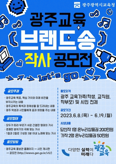 ºê·£µå ¼ÛÀÇ °æ¿ì ±¤ÁÖ ±³À°°¡Á·(Çлý¡¤±³Á÷¿ø¡¤Çкθð) ¹× ½Ã¹Î ´ë»óÀ¸·Î °¡»ç °ø¸ð¸¦ ÁøÇàÇÑ´Ù. ÁÖÁ¦´Â ±¤ÁÖ±³À°ÀÇ Á¤Ã¼¼º°ú ¹Ì·¡ ºñÀü, ±¤ÁÖ Çлýµé¿¡°Ô ²Þ°ú Èñ¸ÁÀ» ÁÖ´Â ³»¿ëÀ¸·Î ¼³Á¤Çß´Ù. °ø¸ð ±â°£Àº 8~19ÀÏÀ̸ç, ÃÖÁ¾ ´ç¼±ÀÛ 1¸í, °¡ÀÛ 2¸íÀ» ¼±Á¤ÇÑ´Ù. ´ç¼±ÀÛÀ» ¹ÙÅÁÀ¸·Î Àü¹®°¡¿¡°Ô ÀÛ°îÀ» ÀÇ·ÚÇÏ°í °ËÅä ¹× È®Á¤À» ¸¶Ä£ ÈÄ È°¿ëÀ» ¾È³»ÇÒ °èȹÀÌ´Ù.