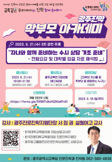 ÇÑÆí ¡®±¤ÁÖÁøÇÐ ÇÐºÎ¸ð ¾ÆÄ«µ¥¹Ì Ư°¡¯Àº ÃßÈÄ ½Ã±â¿¡ ¸Â´Â ÀûÇÕÇÑ ÁÖÁ¦·Î ÆîÃÄÁú ¿¹Á¤ÀÌ´Ù. À̾îÁö´Â °ÀÇ´Â ¡ãÇб³¿¡¼ ³¡³»´Â ÇлýºÎÁ¾ÇÕÀüÇü Áغñ(9¿ù) ¡ãÇлýºÎ±³°úÀüÇüÀ» À§ÇÑ ´ëÇÐ ¾îµð°¡ Ȱ¿ë¹ý(10¿ù) ¡ãÇлýºÎÁ¾ÇÕÀüÇüÀ» À§ÇÑ °ú¸ñ ¼±Åðú ´ëÇÐÀÇ Æò°¡(12¿ù) ¼ø¼·Î ¿î¿µÇÑ´Ù.