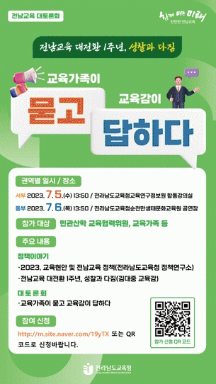 ÇÑÆí ¡®Àü³²±³À° ´ëÅä·Ðȸ¡¯Âü¿© ¹æ¹ý°ú ÀÚ¼¼ÇÑ Çà»ç ³»¿ë°ú °ü·ÃÇØ¼´Â Àü¶ó³²µµ±³À°Ã» ´©¸®Áý°ú SNS¿¡¼ È®ÀÎÇÒ ¼ö ÀÖ´Ù.