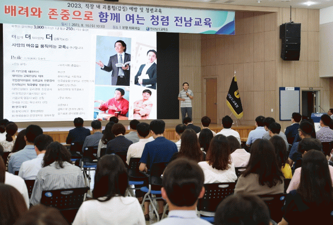 [ÅåÅå´º½º]Àü¶ó³²µµ±³À°Ã»ÀÌ 8¿ù 16ÀÏ ¿ÀÀü û»ç 2Ãþ ´ëȸÀǽǿ¡¼ º»Ã» Àü Á÷¿øÀ» ´ë»óÀ¸·Î¡®2023³â Á÷Àå ³» ±«·ÓÈû(°©Áú) ¿¹¹æ û·Å ±³À°¡¯À» ½Ç½ÃÇß´Ù.