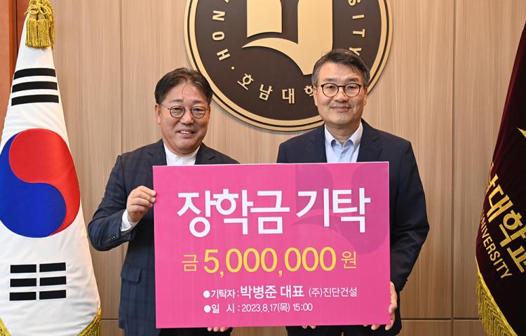 [ÅåÅå´º½º]¹Ú»óö È£³²´ëÇб³ ÃÑÀåÀº 8¿ù 17ÀÏ ¿ÀÈÄ 3½Ã ÃÑÀå½Ç¿¡¼ (ÁÖ)Áø´Ü°Ç¼³ ´ëÇ¥ÀÎ ¹Úº´ÁØ µ¿¹®À¸·ÎºÎÅÍ ÀåÇÐ±Ý 5¹é¸¸¿øÀ» ±âŹ¹Þ¾Ò´Ù.