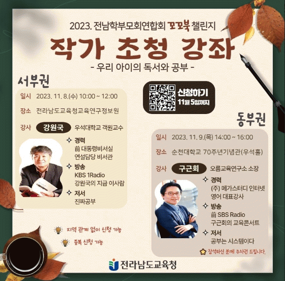 [ÅåÅå´º½º]Àü¶ó³²µµ±³À°Ã»Àº Àü³²Çкθðȸ¿¬ÇÕȸ¿Í ÇÔ²² 2023³â Àü³²Çкθðȸ¿¬ÇÕȸ Ư»ö»ç¾÷ÀÎ ¡®²¿²¿ºÏ(²¿¸®¿¡ ²¿¸®¸¦ ¹«´Â BOOK) 縰Áö¡¯¿Í ¿¬°èÇÑ ÀÛ°¡ ÃÊû Çкθð °Á¸¦ 11¿ù 8ÀÏ(¼ö)°ú 9ÀÏ ¸ñ¿äÀÏ ±Ç¿ª º°·Î °³ÃÖÇß´Ù.