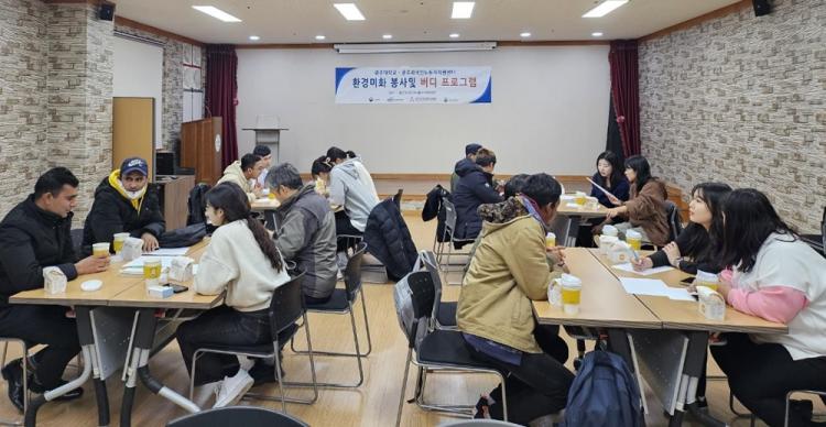 [ÅåÅå´º½º]±¤ÁÖ´ëÇб³(ÃÑÀå ±èµ¿Áø) ÇлýµéÀº Áö³ 3ÀÏ ±¤»ê±¸ Àå´öµ¿ µµ¼°ü °ø¿ø ÀÏ¿ø¿¡¼ Áö¿ª »çȸ ȯ°æ ¹ÌÈ ºÀ»çȰµ¿À» ÆîÃÆ´Ù. ¶ÇÇÑ ¿Ü±¹ÀÎ ³ëµ¿ÀÚµéÀÇ ¾ÈÁ¤ÀûÀÎ Á¤Âø°ú »îÀÇ Áú Çâ»óÀ» À§ÇØ Çѱ¹¾î ¹öµð ÇÁ·Î±×·¥µµ ¿î¿µÇß´Ù.