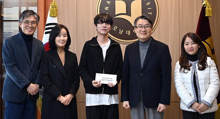 [ÅåÅå´º½º]¹Ú»óö È£³²´ëÇб³ ÃÑÀåÀº 1¿ù 25ÀÏ ±¹Á¦ ¿µÈ¹«´ë¿¡¼ ÀÚ½ÅÀÇ ¿¹¼úÀû ´É·ÂÀ» ¼±º¸À̸ç Çб³ÀÇ À§»óÀ» ³ôÀÎ ¹Ìµð¾î¿µ»ó°ø¿¬Çаú Áß±¹ÀÎ À¯Çлý ¡º¸¿ø Çлý(4Çгâ)¿¡°Ô ÀåÇбÝÀ» Àü´ÞÇÏ°í °Ý·ÁÇß´Ù.