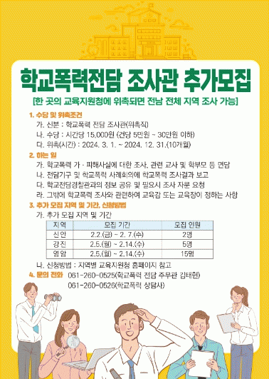 °Áø±³À°Áö¿øÃ»Àº 2¿ù 5ÀϺÎÅÍ 14ÀϱîÁö 5¸íÀ» ¸ðÁýÇϰí, ¿µ¾Ï±³À°Áö¿øÃ»Àº °°Àº ±â°£ 15¸íÀ» ¸ðÁýÇÑ´Ù. ¶Ç, ½Å¾È±³À°Ã»Àº 2¿ù 2ÀϺÎÅÍ 7ÀϱîÁö 2¸íÀ» ¸ðÁýÇÑ´Ù. À§ÃËµÈ Çб³Æø·ÂÀü´ãÁ¶»ç°üÀº Àü³² Àü Áö¿ª¿¡¼ Ȱµ¿ÀÌ °¡´ÉÇÏ´Ù.