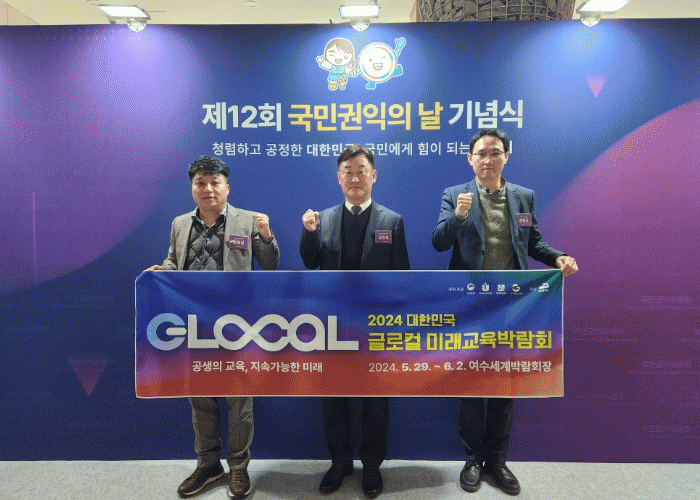 ±¹¹Î±ÇÀÍÀÇ ³¯ ǥâÀ» ¹ÞÀº Àü³²µµ±³À°Ã» Á÷¿øµéÀÌ ¡®2024. ´ëÇѹα¹ ±Û·ÎÄà ¹Ì·¡±³À°¹Ú¶÷ȸ¡¯ È«º¸ Çö¼ö¸·À» µé°í ±â³ä»çÁøÀ» Âï°í ÀÖ´Ù.(¿ÞÂʺÎÅÍ ÀüÁ¤¼º ÁÖ¹«°ü, ±èÀüÈ£ »ç¹«°ü, ÃßÇü±Ù ÁÖ¹«°ü)