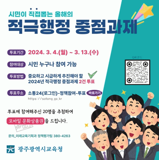 [ÅåÅå´º½º]±¤Áֽñ³À°Ã»ÀÌ 3¿ù 4ÀϺÎÅÍ 13ÀϱîÁö ½Ã¹Î ´©±¸³ª Âü¿© °¡´ÉÇÑ ¿Â¶óÀÎ ÅõÇ¥·Î ¡®2024³â Àû±ØÇàÁ¤ ÁßÁ¡°úÁ¦¡¯¸¦ ¼±Á¤ÇÑ´Ù.