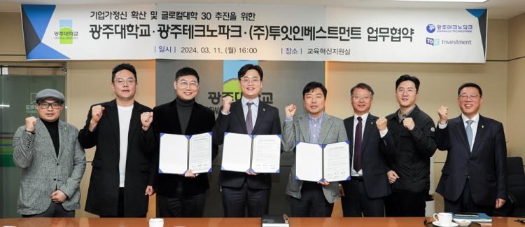 [ÅåÅå´º½º]±¤ÁÖ´ëÇб³(ÃÑÀå ±èµ¿Áø)´Â 11ÀÏ ¿ÀÈÄ ±³³» ÇàÁ¤°ü ±³À°Çõ½ÅÁö¿ø½Ç¿¡¼ ±¤ÁÖÅ×Å©³ëÆÄÅ©(¿øÀå ±è¿µÁý) ¹× ÅõÀÕÀκ£½ºÆ®¸ÕÆ®(´ëÇ¥ ÀÌÇü¹Î)¿Í ±â¾÷°¡Á¤½Å È®»ê ¹× ±Û·ÎÄôëÇÐ 30 °øµ¿ÃßÁøÀ» À§ÇÑ ¾÷¹«Çù¾àÀ» ü°áÇß´Ù.