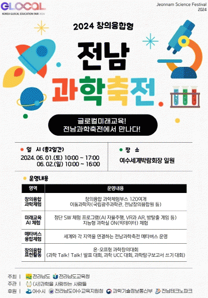 Àü¶ó³²µµ±³À°Ã»Àº ¿À´Â 6¿ù 1~2ÀÏ ¿©¼ö¼¼°è¹Ú¶÷ȸÀå¿¡¼ ¡®Àü³²°úÇÐÃàÀü¡¯À» ¡®2024 ´ëÇѹα¹ ±Û·ÎÄà ¹Ì·¡±³À°¹Ú¶÷ȸ¡¯¿Í ¿¬°èÇØ °³ÃÖÇÑ´Ù. ÀÌ ÃàÁ¦¿¡´Â Àü³²ÀÇ µµ¼ Áö¿ª»Ó ¾Æ´Ï¶ó, ¿ï¸ªµµ Çлýµéµµ ¿Â¶óÀÎÀ¸·Î Âü¿©ÇÑ´Ù.
