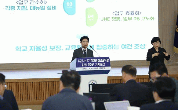 Àü¶ó³²µµ±³À°Ã»ÀÌ 2ÀÏ ¿ÀÀü û»ç 2Ãþ ´ëȸÀǽǿ¡¼ ÁÖ¹ÎÁ÷¼± 4±â ±è´ëÁß ±³À°°¨ ÃëÀÓ 2Áֳ⠱âÀÚȸ°ßÀ» °®°í ÀÌ·± ³»¿ëÀÇ ÇâÈÄ ÁÖ¿ä Á¤Ã¥ ÃßÁø°èȹÀ» ¹ßÇ¥Çß´Ù.