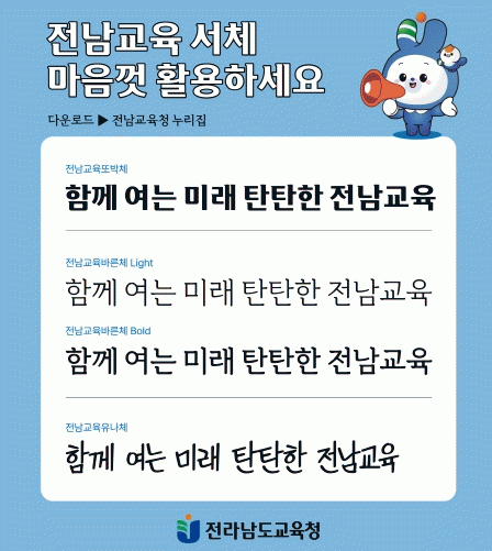 À̹ø¿¡ °³¹ßµÈ Àü³²±³À° Àü¿ë¼Ã¼´Â °íµñ °è¿(¶Ç¹Úü), ¸íÁ¶ °è¿(¹Ù¸¥Ã¼), ¼Õ±Û¾¾ °è¿(À¯³ªÃ¼) µî 3°¡Áö ŸÀÔÀÇ ±Û¾¾Ã¼ 4Á¾À̸ç ÇÑ±Û 2780ÀÚ, ¿µ¹® 94ÀÚ, Ư¼ö¹®ÀÚ 986ÀÚ·Î ±¸¼ºµÆ´Ù. ¡®¶Ç¹Úü¡¯´Â ±âÁ¸ ·Î°í¿¡ Çö´ëÀû °¨°¢À» ´õÇßÀ¸¸ç, ¡®¹Ù¸¥Ã¼¡¯´Â ³ë·ÂÀÇ ¹°¹æ¿ïµéÀÌ ¸ð¿© ¹Ì·¡¸¦ ¸¸µé¾î°¡´Â ¸ð½ÀÀ» Çü»óÈÇß´Ù. ¶Ç, ¡®À¯³ªÃ¼¡¯´Â Áö³ÇØ ´ë±¹¹Î ¼Õ±Û¾¾ °ø¸ðÀüÀ» ÅëÇØ ¼±Á¤µÈ ½ÇÁ¦ Çкθð ±Û¾¾Ã¼¶ó´Â Á¡¿¡¼ °øµ¿Ã¼ Âü¿©ÀÇ Àǹ̸¦ ´õÇÑ´Ù. ƯÈ÷, 3°¡Áö ŸÀÔ ¸ðµÎ µðÁöÅÐ ±³°ú¼ ½Ã´ë¿¡ ¹ß¸ÂÃç ¸ð¹ÙÀÏ ¹× À¥¿¡¼µµ ±ÛÀÚ°¡ ±ò²ûÇÏ°Ô Ç¥ÇöµÉ ¼ö ÀÖµµ·Ï ¿Â¶óÀΠȯ°æÄ£ÈÀûÀ¸·Î °³¹ßµÆ´Ù.