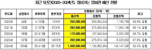 ±¹È¸ ¹®ÈüÀ°°ü±¤À§¿øÈ¸ ¹ÎÇü¹è ÀÇ¿ø(´õºÒ¾î¹ÎÁÖ´ç, ±¤ÁÖ ±¤»êÀ»)ÀÌ ¹®ÈüÀ°°ü±¤ºÎ·ÎºÎÅÍ Á¦Ãâ¹ÞÀº ÀÚ·á¿¡ µû¸£¸é, 2020³âºÎÅÍ 2025³â 8¿ù±îÁö Àüü 1,255°ÇÀÇ »ó¿µ °¡¿îµ¥ ±¤ÁÖ¿¡¼ ¿¸° °ÍÀº ´Ü 5°Ç¿¡ ºÒ°úÇß´Ù. 100°Ç Áß 4°Ç²ÃÀÌ´Ù.