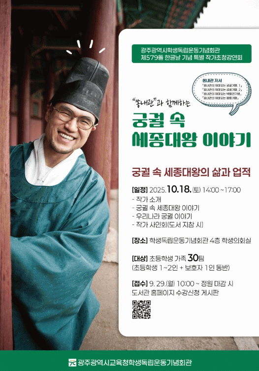 ¼Û ÀÛ°¡´Â Á¶¼±½Ã´ë ±Ã±È ¹®È¸¦ ÅëÇØ ¼¼Á¾´ë¿ÕÀÇ Ã¶Çаú ¾Ö¹ÎÁ¤½Å, ÇѱÛâÁ¦ ¿ª»ç µîÀ» Èï¹Ì·Ó°Ô Àü´ÞÇÑ´Ù. °¿¬ ÈÄ¿¡´Â µµ¼ »çÀÎȸ, »çÁø ÃÔ¿µ µî ÀÛ°¡¿ÍÀÇ ¸¸³² ½Ã°£µµ ¸¶·ÃµÈ´Ù.