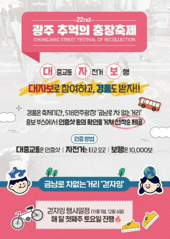 [ÅåÅå´º½º]±¤ÁÖ µ¿±¸´Â ¿À´Â 15ÀϺÎÅÍ 5Àϰ£ ±Ý³²·Î¿Í ÃæÀå·Î ÀÏ¿ø¿¡¼ ¿¸®´Â Á¦22ȸ ±¤ÁÖ Ãß¾ïÀÇ ÃæÀåÃàÁ¦¿¡¼ ¡®±Ý³²·Î Â÷ ¾ø´Â °Å¸®¡¯ÀÇ °¡Ä¡¸¦ ¾Ë¸®°í ´ëÀÚº¸ µµ½Ã Á¤Ã¥¿¡ ½Ã¹Î Âü¿©¸¦ È®´ëÇϱâ À§ÇÑ Æ¯º° È«º¸ À̺¥Æ®¸¦ ÁøÇàÇÑ´Ù°í ¹àÇû´Ù.