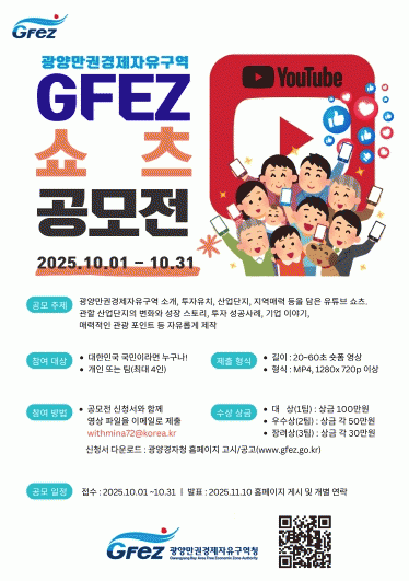 [ÅåÅå´º½º]±¤¾ç¸¸±Ç°æÁ¦ÀÚÀ¯±¸¿ªÃ»(ûÀå ±¸Ãæ°ï)Àº 10¿ù 1ÀϺÎÅÍ 31ÀϱîÁö ±¹¹Î Âü¿©Çü ¡®2025 GFEZ À¯Æ©ºê ¼îÃ÷ °ø¸ðÀü¡¯À» °³ÃÖÇÑ´Ù°í ¹àÇû´Ù.