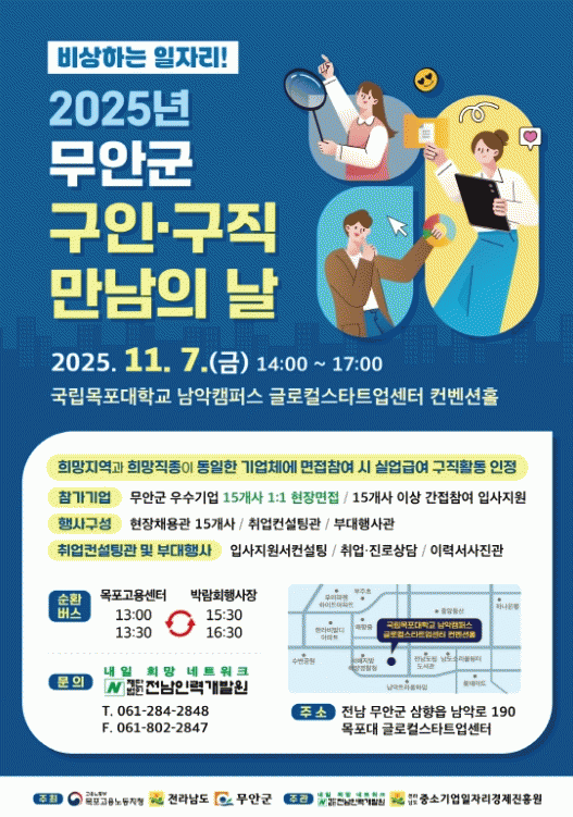 [ÅåÅå´º½º]Àü³² ¹«¾È±ºÀº ¿À´Â 11¿ù 7ÀÏ ¸ñÆ÷´ëÇб³ ³²¾ÇÄ·ÆÛ½º ±Û·ÎÄýºÅ¸Æ®¾÷¼¾ÅÍ ÄÁº¥¼ÇȦ¿¡¼ °³ÃÖÇÏ´Â ¡º2025³â ¹«¾È±º ±¸ÀΡ¤±¸Á÷ ¸¸³²ÀÇ ³¯¡»Çà»ç¿¡ Âü¿©ÇÒ ±â¾÷À» ¸ðÁýÇÑ´Ù.