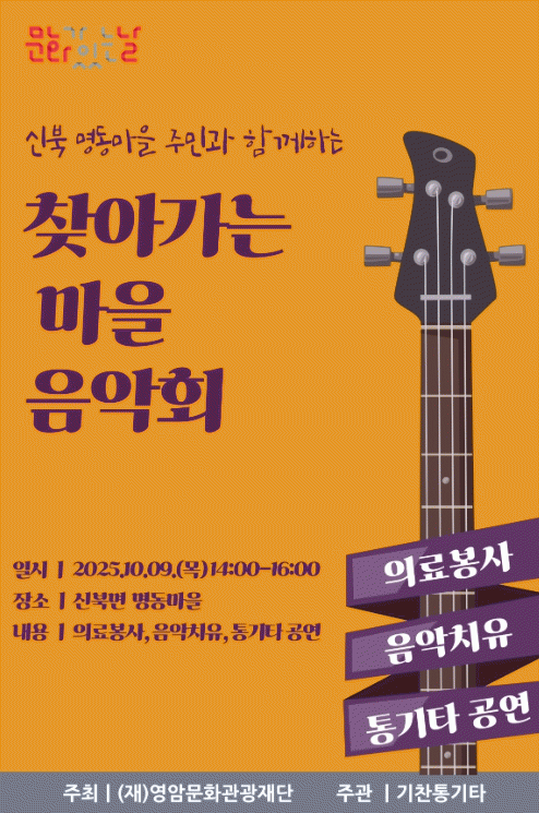 [ÅåÅå´º½º](Àç)¿µ¾Ï¹®È°ü±¤Àç´ÜÀº 2025 ¹®È°¡ ÀÖ´Â ³¯ Çà»çÁö¿ø »ç¾÷À¸·Î »ýȰ¹®È µ¿È£È¸ÀÎ ±âÂùÅë±âŸ(´ëÇ¥:ÃÖ¹®ÀÏ)¿Í ÇÔ²² ½ÅºÏ ¸íµ¿¸¶À» ÁÖ¹ÎÀ» ´ë»óÀ¸·Î ÇÑ ¡®Ã£¾Æ°¡´Â ¸¶À» À½¾Çȸ¡¯¸¦ ¿À´Â 10¿ù 9ÀÏ Çѱ۳¯¿¡ °³ÃÖÇÑ´Ù°í ¹àÇû´Ù.