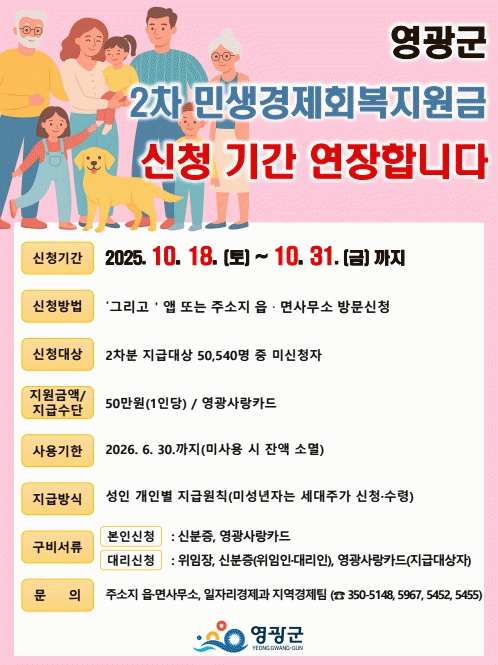 [ÅåÅå´º½º]¿µ±¤±ºÀº Àü ±º¹Î¿¡°Ô 50¸¸ ¿ø(2Â÷ºÐ)À» Áö±ÞÇÏ´Â ¹Î»ý°æÁ¦È¸º¹Áö¿ø±Ý ½Åû ±â°£À» 10¿ù 31ÀϱîÁö 2ÁÖ ´õ ¿¬ÀåÇÑ´Ù.