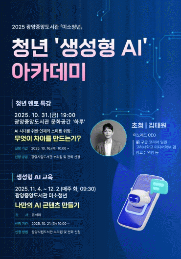 [ÅåÅå´º½º]±¤¾çÁß¾Óµµ¼°üÀÌ Ã»³âµéÀÇ µðÁöÅРȰ¿ë ¿ª·®À» °ÈÇϰí âÀÇÀû ÀÚ±â°è¹ßÀ» Áö¿øÇϱâ À§ÇÑ ÇÁ·Î±×·¥ ¡®Ã»³â »ý¼ºÇü AI ¾ÆÄ«µ¥¹Ì¡¯ÀÇ ¼ö°»ýÀ» ¸ðÁýÇÑ´Ù.