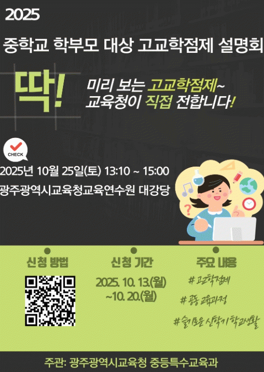 [ÅåÅå´º½º]±¤Áֽñ³À°Ã»Àº ¿À´Â 25ÀÏ ¿ÀÈÄ 1½Ã ±¤Áֽñ³À°Ã»±³À°¿¬¼ö¿ø ´ë°´ç¿¡¼ ÁßÇб³ 3Çгâ Çлý Çкθ𸦠´ë»óÀ¸·Î ¡®°í±³ÇÐÁ¡Á¦ ¼³¸íȸ¡¯¸¦ °³ÃÖÇÑ´Ù.