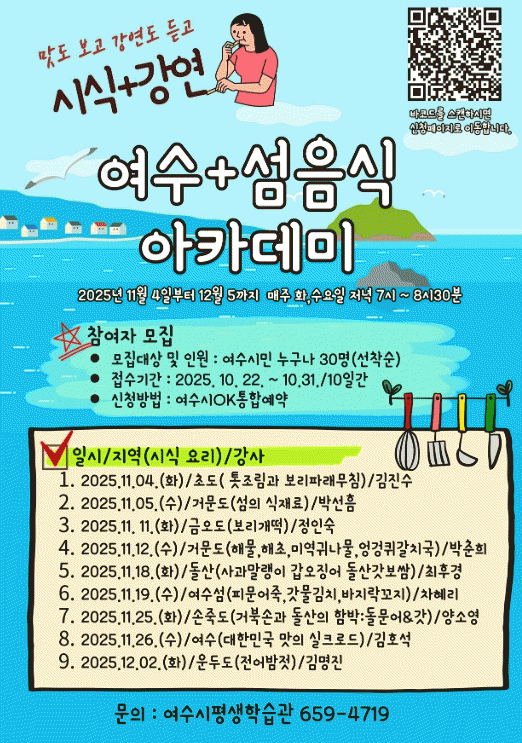 [ÅåÅå´º½º]¿©¼ö½Ã´Â ¼¶ Áö¿ª °íÀ¯ÀÇ ½Ä¹®È¸¦ ¹ß±¼ÇÏ°í ½Ã¹Î°ú ÇÔ²² °øÀ¯Çϱâ À§ÇØ ¿À´Â 11¿ù 4ÀϺÎÅÍ 12¿ù 5ÀϱîÁö ¸ÅÁÖ È¡¤¼ö¿äÀÏ ¿ÀÈÄ 7½Ã Æò»ýÇнÀ°ü¿¡¼ ¡®¿©¼ö+¼¶À½½Ä ¾ÆÄ«µ¥¹Ì¡¯¸¦ ¿î¿µÇÑ´Ù.
