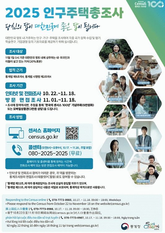 [ÅåÅå´º½º]¼øÃµ½Ã´Â 10¿ù 22ÀϺÎÅÍ 11¿ù 18ÀϱîÁö ¡®2025 Àα¸ÁÖÅÃÃÑÁ¶»ç¡¯¸¦ ½Ç½ÃÇÑ´Ù°í ¹àÇû´Ù.