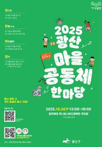 ±¤»ê¸¶À»°øµ¿Ã¼ÇѸ¶´çÀº ¡®¸¶À» ¾ÆÀ̵¹, ¿ì¸® µ¿³× ¼ûÀº ¿µ¿õ¡¯À» ÁÖÁ¦·Î 2025³â ±¤»êÇü ¸¶À»°øµ¿Ã¼ Áö¿ø»ç¾÷ Áֹΰø¸ð»ç¾÷¿¡ ¼±Á¤µÈ ´ÜüµéÀÌ ÀڽŵéÀÇ È°µ¿À» ±æ°Å¸® °ø¿¬, °¢Á¾ üÇè, Àü½Ã µî ´Ù¾çÇÑ ¹æ½ÄÀ¸·Î ¼±º¸ÀÌ´Â Çà»ç´Ù.