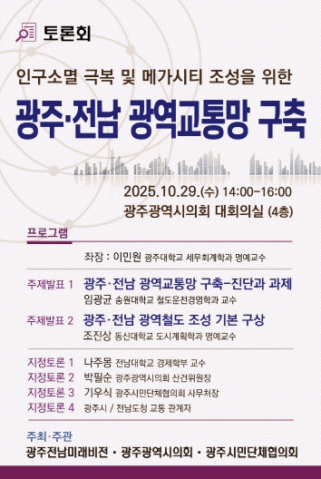 [ÅåÅå´º½º]±¤ÁÖ¡¤Àü³²ÀÇ Àα¸¼Ò¸ê À§±â¿Í ¼öµµ±Ç ÁýÁß¿¡ ´ëÀÀÇϱâ À§ÇÑ 'Àα¸¼Ò¸ê ±Øº¹ ¹× ¸Þ°¡½ÃƼ Á¶¼ºÀ» À§ÇÑ ±¤ÁÖ¡¤Àü³² ±¤¿ª±³Åë¸Á ±¸Ãà' Åä·Ðȸ°¡ ¿À´Â 10¿ù 29ÀÏ ¿ÀÈÄ 2½ÃºÎÅÍ 4½Ã±îÁö ±¤ÁÖ±¤¿ª½ÃÀÇȸ ´ëȸÀǽÇ(4Ãþ)¿¡¼ ¿¸°´Ù.