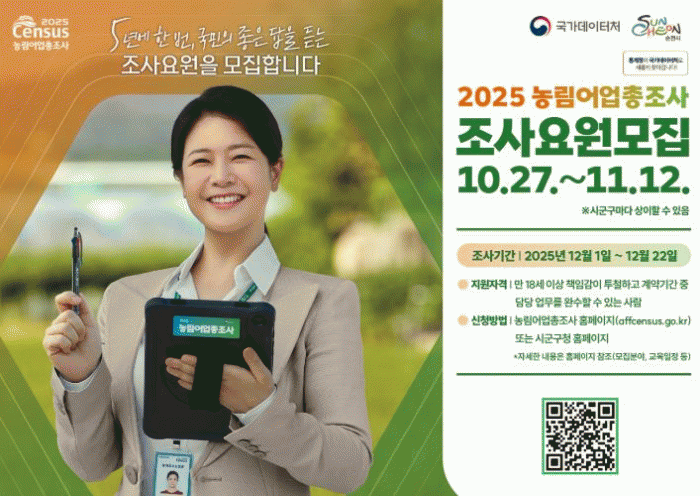 [ÅåÅå´º½º]¼øÃµ½Ã´Â ¿À´Â 11¿ù ¸»ºÎÅÍ ½Ç½ÃµÇ´Â 2025 ³ó¸²¾î¾÷ÃÑÁ¶»ç ¾÷¹«¸¦ ¼öÇàÇÒ Á¶»ç¿ä¿øÀ» ¸ðÁýÇÑ´Ù°í ¹àÇû´Ù.