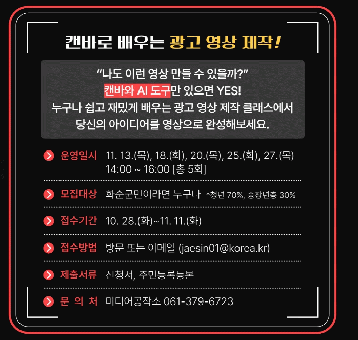 ±³À° ÀÏÁ¤Àº 11¿ù 13ÀϺÎÅÍ 27ÀϱîÁö ÃÑ 5ȸ¿¡ °ÉÃÄ ¿ÀÈÄ 2½ÃºÎÅÍ 4½Ã±îÁö ÁøÇàµÇ¸ç, ±³À°»ýµéÀº ¹è¿î ³»¿ëÀ» ¹ÙÅÁÀ¸·Î È«º¸³ª SNS ÄÜÅÙÃ÷ Á¦ÀÛ¿¡ ¹Ù·Î Ȱ¿ëÇÒ ¼ö ÀÖ´Â ½Ç¹« ¿ª·®À» ÀÍÈ÷°Ô µÈ´Ù.