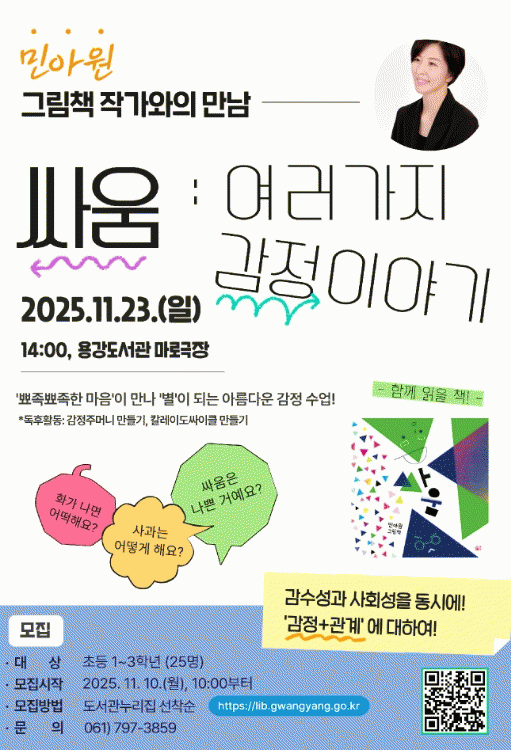 [ÅåÅå´º½º]±¤¾ç¿ë°µµ¼°üÀº ¿À´Â 11¿ù 23ÀÏ ¿ÀÈÄ 2½Ã, ¸¶·Î±ØÀå¿¡¼ ÃʵîÇб³ 1~3Çг⠾À̸¦ ´ë»óÀ¸·Î ±×¸²Ã¥ ¡º½Î¿ò¡»ÀÇ ÀúÀÚ ¹Î¾Æ¿ø ÀÛ°¡¿ÍÀÇ ¸¸³²À» ¿î¿µÇÑ´Ù°í ¹àÇû´Ù.