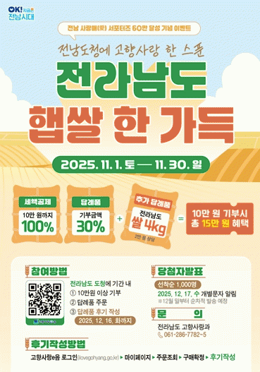 À̺¥Æ® Âü¿©´Â Àü³²µµÃ»¿¡ 10¸¸ ¿ø ÀÌ»ó ±âºÎÇÑ ÈÄ, °íÇâ»ç¶ûeÀ½¿¡¼ ´ä·ÊǰÀ» ÁÖ¹®¡¤¼ö·ÉÇÑ ´ÙÀ½ Èı⸦ ÀÛ¼ºÇϸé ÀÚµ¿À¸·Î ½ÅûµÈ´Ù. ÀÚ¼¼ÇÑ À̺¥Æ® °ü·Ã ³»¿ëÀº °íÇâ»ç¶ûeÀ½(ilovegohyang.go.kr) ´©¸®Áý¿¡¼ È®ÀÎÇÒ ¼ö ÀÖ´Ù.