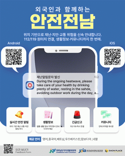 [ÅåÅå´º½º]Àü¶ó³²µµÀÚÄ¡°æÂûÀ§¿øÈ¸´Â Àü³² ü·ù ¿Ü±¹ÀÎÀÇ ¾ÈÀü »ç°¢Áö´ë¸¦ ÇØ¼ÒÇÏ°í ¾ð¾î À庮¿¡ µû¸¥ Àç³À̳ª ¹üÁË ´ëÀÀÀÇ ¾î·Á¿òÀ» ÁÙÀ̱â À§ÇØ ¡®´Ù±¹¾î ¾ÈÀüÀü³²¡¯ ¾ÛÀ» °³¹ß, º»°Ý ¼ºñ½ºÇÑ´Ù°í ¹àÇû´Ù.