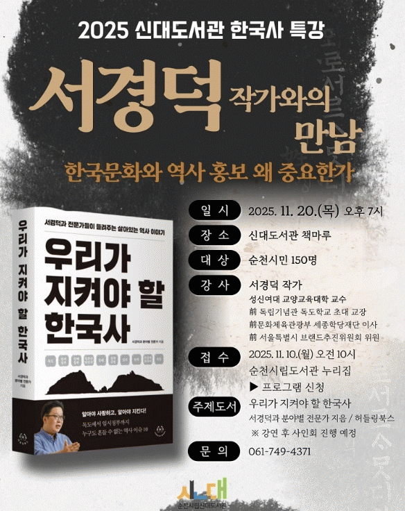 [ÅåÅå´º½º]¼øÃµ½Ã´Â ¿À´Â 20ÀÏ ¿ÀÈÄ 7½Ã, ¼øÃµ½Ã¸³½Å´ëµµ¼°ü Ã¥¸¶·ç¿¡¼ ¼°æ´ö ¼º½Å¿©ÀÚ´ëÇб³ ±³¼ö¸¦ ÃÊÃ»ÇØ ¡®Çѱ¹ ¹®È¿Í ¿ª»ç È«º¸, ¿Ö Áß¿äÇѰ¡¡¯¸¦ ÁÖÁ¦·Î °¿¬À» °³ÃÖÇÑ´Ù.