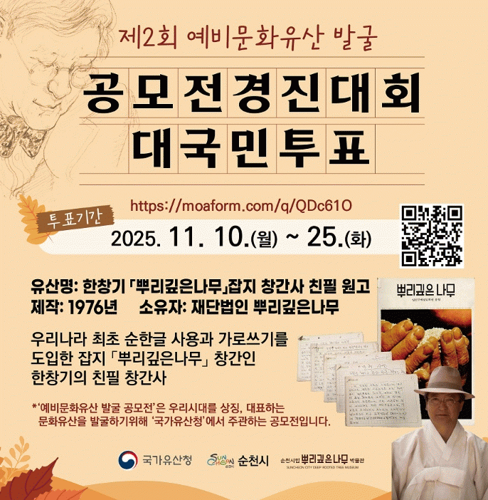 ½Ã °ü°èÀÚ´Â ¡°±¹¹ÎÀÌ Á÷Á¢ ¼±ÅÃÇÏ´Â À̹ø °ø¸ðÀüÀÌ ÇÑâ±â ¼±»ýÀÇ ¹®ÈÈ¥À» ³Î¸® ¾Ë¸®´Â ±âȸ°¡ µÇ±â¸¦ ¹Ù¶õ´Ù¡±¸ç, ¡°¼øÃµ½Ã¹ÎÀ» ºñ·ÔÇÑ ¸ðµç ±¹¹Î²²¼ ÅõÇ¥¿¡ Âü¿©ÇØ Ä£ÇÊ¿ø°í°¡ ¿¹ºñ¹®ÈÀ¯»êÀ¸·Î ¼±Á¤µÉ ¼ö ÀÖµµ·Ï ¸¹Àº °ü½É°ú ÀÀ¿øÀ» ºÎʵ台´Ù¡±°í ¸»Çß´Ù.