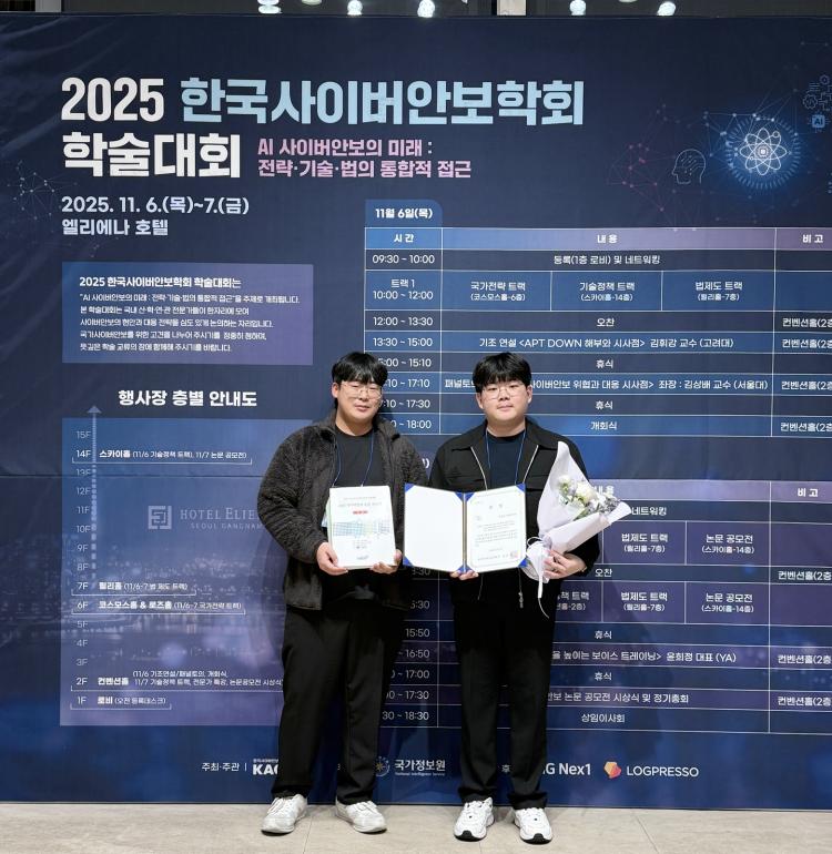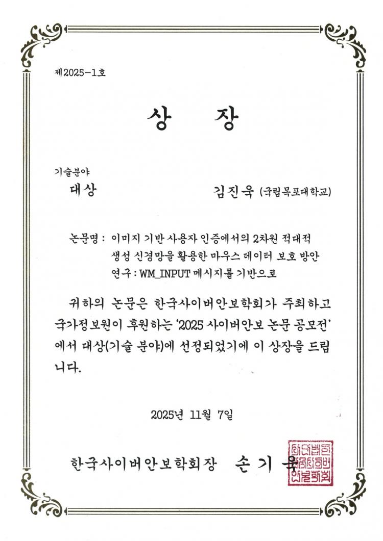 ¸ñÆ÷´ë Á¤º¸º¸È£Çаú ±èÁø¿í ´ëÇпø»ý, ¡®2025 »çÀ̹ö¾Èº¸ ³í¹® °ø¸ðÀü¡¯ ±â¼ú ºÐ¾ß ´ë»ó ¼ö»ó