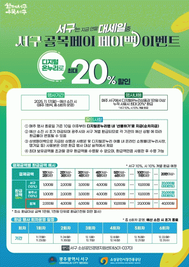¶ÇÇÑ ±¤ÁÖ±¤¿ª½ÃÀÇ 10% ȯ±ÞÇà»ç¿Í ¿¬°èÇÒ °æ¿ì ¼ÒºñÀÚ´Â ÃÖ´ë 20% ÇÒÀÎ ÇýÅÃÀ» ¹ÞÀ» ¼ö ÀÖ¾î Àü±¹¿¡¼ À¯ÀÏÇÏ°Ô 20% ÇýÅÃÀÌ À¯ÁöµÇ´Â Áö¹æÁ¤ºÎ°¡ µÆ´Ù. ¼ÒºñÀÚ´Â ¼±¸¿¡¼ ÀÏÁÖÀÏ¿¡ ¿Â´©¸®»óǰ±Ç 20¸¸¿øÀ» ¼ÒºñÇϸé 4¸¸¿øÀ» µÇµ¹·Á¹ÞÀ» ¼ö ÀÖÀ¸¸ç, ¼±¸´Â À̹ø Çà»ç·Î ¾à 120¾ï¿ø ±Ô¸ðÀÇ Áö¿ª°æÁ¦ ÆÄ±ÞÈ¿°ú¸¦ ±â´ëÇϰí ÀÖ´Ù.