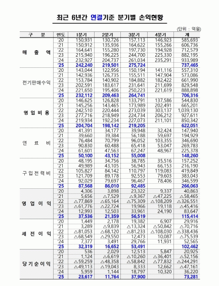 [ÅåÅå´º½º]Çѱ¹Àü·ÂÀº 3ºÐ±â °á»ê °á°ú, ¿¬°á±âÁØ ¸ÅÃâ¾× 73Á¶ 7,465¾ï¿ø, ¿µ¾÷ºñ¿ë 62Á¶ 2,051¾ï¿ø, ¿µ¾÷ÀÌÀÍÀº 11Á¶ 5,414¾ï¿øÀ» ±â·ÏÇßÀ¸¸ç, º°µµ±âÁØÀº ¸ÅÃâ¾× 72Á¶ 4,684¾ï¿ø, ¿µ¾÷ºñ¿ë 66Á¶ 9,324¾ï¿ø, ¿µ¾÷ÀÌÀÍ 5Á¶ 5,360¾ï¿øÀ» ±â·ÏÇß´Ù.