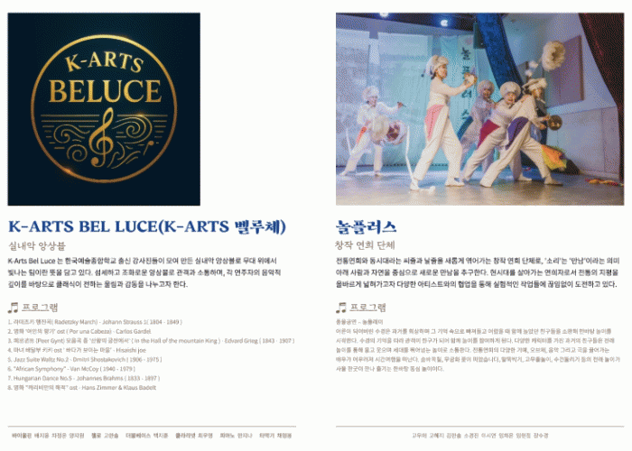 À̹ø °ø¿¬¿¡¼´Â ¿ÀÄɽºÆ®¶ó °»çÁøÀ¸·Î ±¸¼ºµÈ ¡®K-ARTS º§·çü¡¯ÆÀÀÇ ½Ç³»¾Ç ¾Ó»óºí °ø¿¬»Ó ¾Æ´Ï¶ó ¡®³îÇ÷¯½º¡¯ÆÀÀÇ Ã¢ÀÛ ¿¬Èñ °ø¿¬µµ ÇÔ²²ÇØ Å¬·¡½Ä°ú ±¹¾ÇÀÌ ¾î¿ì·¯Áø ¸ÚÁø °ø¿¬ÀÌ ±â´ëµÈ´Ù.
