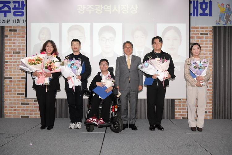 [ÅåÅå´º½º] °±âÁ¤ ±¤ÁÖ±¤¿ª½ÃÀåÀÌ 14ÀÏ ¿ÀÀü Ȧ¸®µ¥ÀÌÀÎÈ£ÅÚ¿¡¼ ¿¸° Àå¾ÖÀÎ ÀÚ¸³»ýȰ ÁõÁø´ëȸ¿¡ Âü¼®ÇØ À¯°øÀÚ Ç¥Ã¢À» ÇÑ ÈÄ ¼ö»óÀÚµé°ú ÇÔ²² ±â³äÃÔ¿µÀ» Çϰí ÀÖ´Ù. /±¤ÁÖ±¤¿ª½Ã Á¦°ø