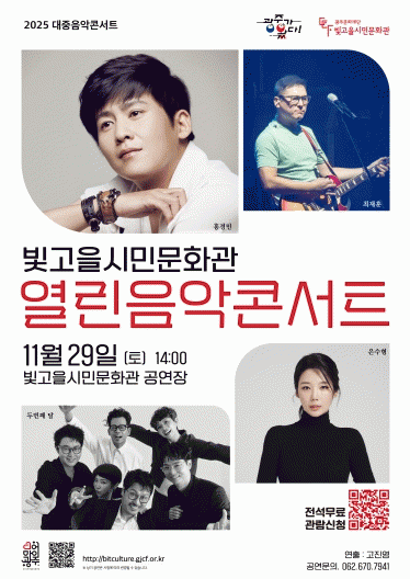 [ÅåÅå´º½º]±¤ÁÖ¹®ÈÀç´ÜÀº ¿À´Â 11¿ù 29ÀÏ ºû°íÀ»½Ã¹Î¹®È°ü °ø¿¬Àå¿¡¼ ¡®2025 ´ëÁßÀ½¾ÇÄܼƮ(2ȸÂ÷)¡¯¸¦ Àü¼® ¹«·á·Î °³ÃÖÇÑ´Ù°í ¹àÇû´Ù. À̹ø °ø¿¬Àº ½Ã¹Î ¹®Èº¹Áö ½ÇÇö°ú ¹®È Á¢±Ù¼º È®´ë¸¦ À§ÇÑ ¿¸° À½¾Çȸ·Î, Áö¿ª¹Î ´©±¸³ª ºÎ´ã ¾øÀÌ Âü¿©ÇÒ ¼ö ÀÖ´Â °ø°ø±âȹ °ø¿¬ÀÌ´Ù.
