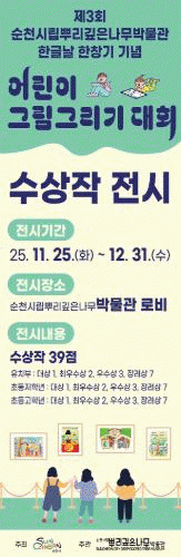 [ÅåÅå´º½º]¼øÃµ½Ã´Â ¿À´Â 11¿ù 25ÀϺÎÅÍ 12¿ù 31ÀϱîÁö ¼øÃµ½Ã¸³»Ñ¸®±íÀº³ª¹«¹Ú¹°°ü »ó¼³Àü½Ã½Ç ·Îºñ¿¡¼ 'Á¦3ȸ ¼øÃµ½Ã¸³»Ñ¸®±íÀº³ª¹«¹Ú¹°°ü Çѱ۳¯ ÇÑâ±â ±â³ä ¾î¸°ÀÌ ±×¸²±×¸®±â ´ëȸ ¼ö»óÀÛ Àü½Ãȸ'¸¦ °³ÃÖÇÑ´Ù.