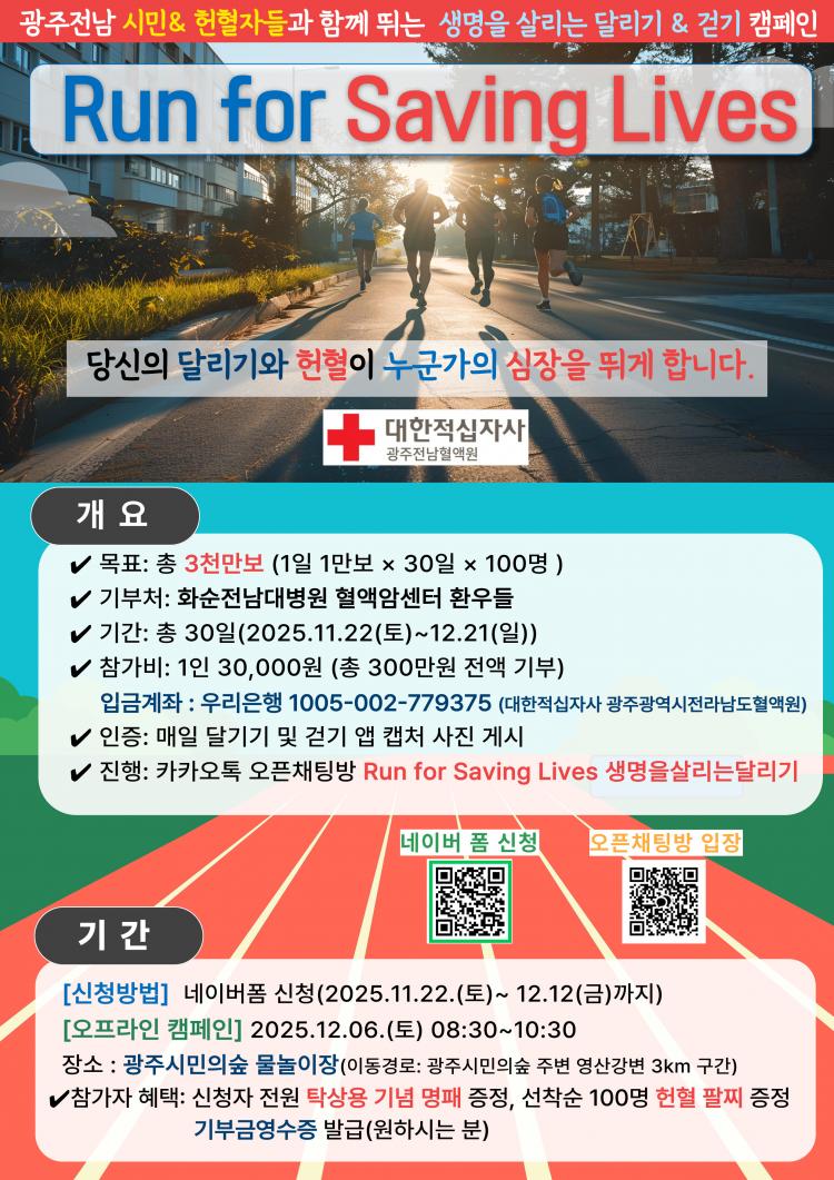 ¡®Run for Saving Lives¡¯Ä·ÆäÀÎÀº ±¤ÁÖÀü³² ½Ã¹Î ´©±¸³ª Âü¿© °¡´ÉÇÏ¸ç ±¤ÁÖÀü³²Ç÷¾×¿ø ÀνºÅ¸ ¶Ç´Â īī¿ÀÅå ¿ÀÇÂäÆÃ¹æ¡®Run for Saving Lives¡¯(»ý¸íÀ»»ì¸®´Â´Þ¸®±â)¸¦ ÅëÇØ Âü¿©°¡ °¡´ÉÇÏ´Ù. 12¿ù 6ÀÏ 9½Ã¿¡´Â ÷´Ü ±¤ÁֽùÎÀǽ£¿¡¼ ¿ÀÇÁ¶óÀÎ °È±â Çà»ç¸¦ ¿Â¶óÀÎ Âü¿©ÀÚ ¹× ´ëÇÑÁÖÅðü¸®»çÇùȸ ±¤ÁÖ½Ãȸ(ȸÀå ¼±Ý¼®) µî ÇåÇ÷ ´Üü ÇåÇ÷ÀÚµé°ú ÇÔ²² ÁøÇàÇÒ ¿¹Á¤ÀÌ´Ù.