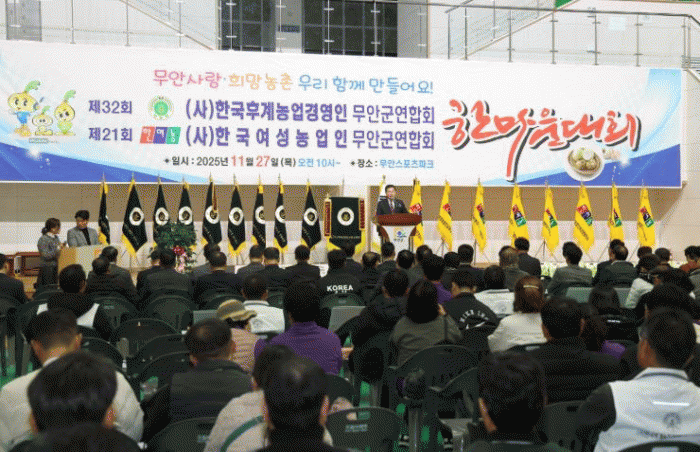 [ÅåÅå´º½º]Àü³² ¹«¾È±ºÀº Áö³ 27ÀÏ ¹«¾È½ºÆ÷Ã÷ÆÄÅ© ÀÏ¿ø¿¡¼ °³ÃÖµÈ 2025³â ¹«¾È±º Çѳ󿬡¤ÇÑ¿©³ó ÇѸ¶À½´ëȸ°¡ 500¿© ¸íÀÇ ³ó¾÷ÀÎÀÌ ÇÔ²²ÇÑ °¡¿îµ¥ ¼ºÈ²¸®¿¡ ¸¶¹«¸®µÆ´Ù°í ¹àÇû´Ù.