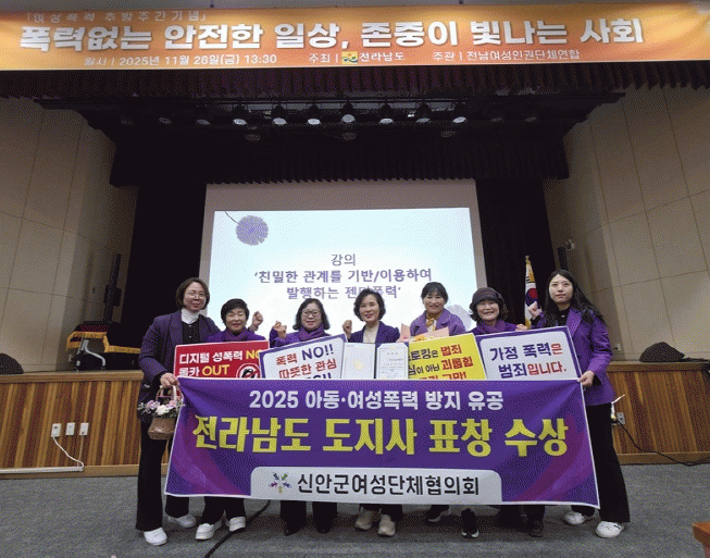[ÅåÅå´º½º]½Å¾È±º¿©¼º´ÜüÇùÀÇȸ(ȸÀå ¾È¹Ì¿µ)°¡ 11¿ù 28ÀÏ Àü³²¿©¼º°¡Á·Àç´Ü¿¡¼ °³ÃÖµÈ ¡®2025³â ¿©¼ºÆø·ÂÃß¹æÁÖ°£ ±â³äÇà»ç¡¯¿¡¼ ¿©¼ºÆø·Â ¹æÁö À¯°øÀ» ÀÎÁ¤¹Þ¾Æ Àü³²µµÁö»ç ǥâÀ» ¼ö»óÇÏ´Â ¿µ¿¹¸¦ ¾È¾Ò´Ù.