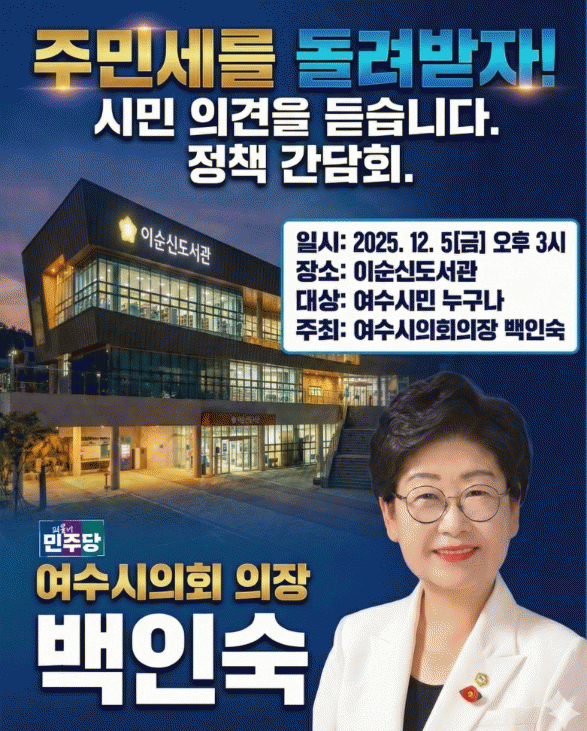 [ÅåÅå´º½º]¹éÀμ÷ ¿©¼ö½ÃÀÇȸ ÀÇÀåÀº ¿À´Â 12¿ù 5ÀÏ ¿ÀÈÄ 3½Ã, À̼ø½Åµµ¼°ü ´Ù¸ñÀû°´ç¿¡¼ ¡®Áֹμ¼ Áö¿ª ȯ¿ø Á¶·ÊÁ¦Á¤ ¹× ÁÖ¹ÎÂü¿©¿¹»êÁ¦ ½ÇÇö¹æ¾È ¸¶·Ã °£´ãȸ¡¯¸¦ °³ÃÖÇÑ´Ù°í 2ÀÏ ¹àÇû´Ù.